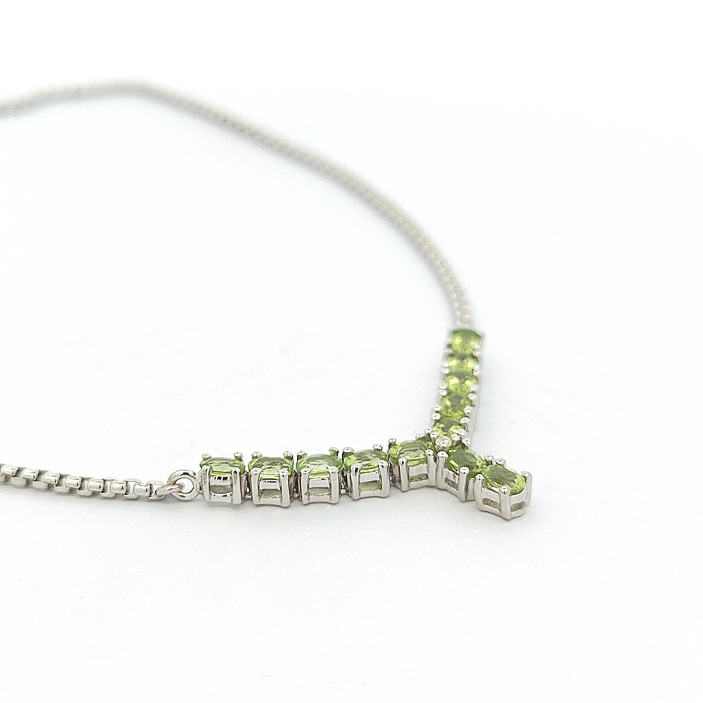 Exquisitely crafted, the Ella Peridot Necklace shines with an alluring sophistication. Its top-grade lime-hued Peridots twinkle like stars, delicately secured in sterling silver and adorned with a brilliant white diamond. The diamond-cut ovals are joined by a rounded box chain, allowing for a timeless look that graces any neckline. For those born in August, the Peridot necklace brings extra luck: it is their birthstone. This gem is also featured in Ella's Peridot earrings and bracelets, perfect for completing the look.